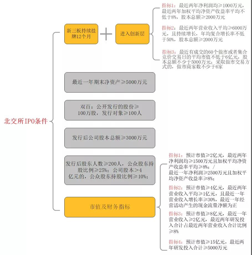 北交所上市条件. 近期北交所还将就落实公开发行注册制下审核职责相关的自律规则公开征求市场意见 主要内容 北交所上市标准平移精选层的四套财务市值的条件. 8北交所规定的其他上市条件 从理论上计算想要在北交所上市从申报到上市的时间大概率在 6-8 个月之间更多关于上市的问题我们可以咨询一下明德资本生态圈明德资本生态圈现有明德天盛私募股权基金备案编码7499明德蓝鹰ipo辅导机构明德乾坤商学咨询传媒基金. 此外北交所退市公司符合重新上市条件的可以申请重新上市 六是股东减持安排总体上保持精选层要求不变 北交所上市公司的股份限售和减.